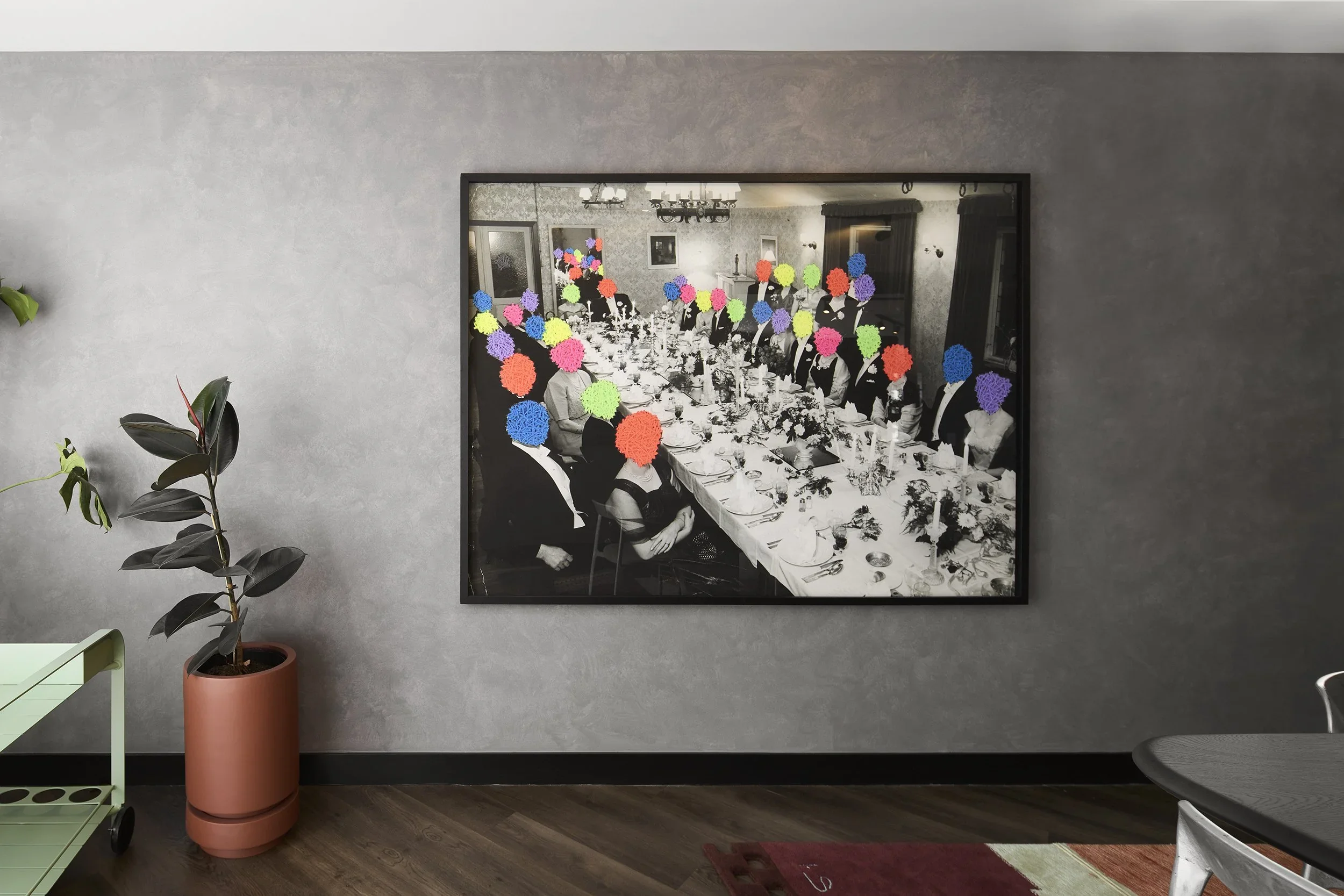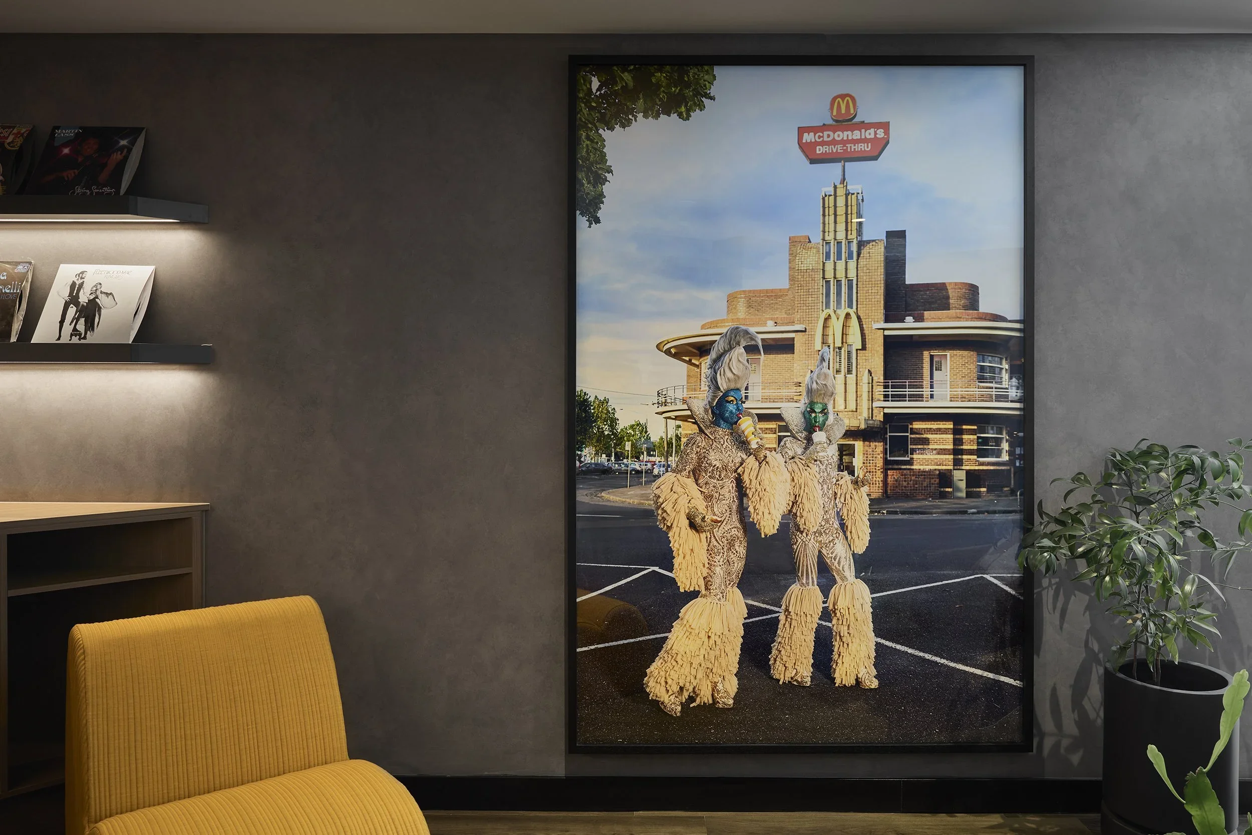 Alongside the selection of key existing works, we commissioned a series of bespoke pieces, developed in direct response to the site. These include of stitched and sourced textiles by emerging artist Hannah Hall that echoes the textures of Fitzroy’s industrial textile past and histories embedded within repurposed garments. A large photographic print by beloved Melbourne duo ‘The Huxleys’ captured just around the corner at the iconic McDonalds brings a sense of joy and playfulness to the record lounge.