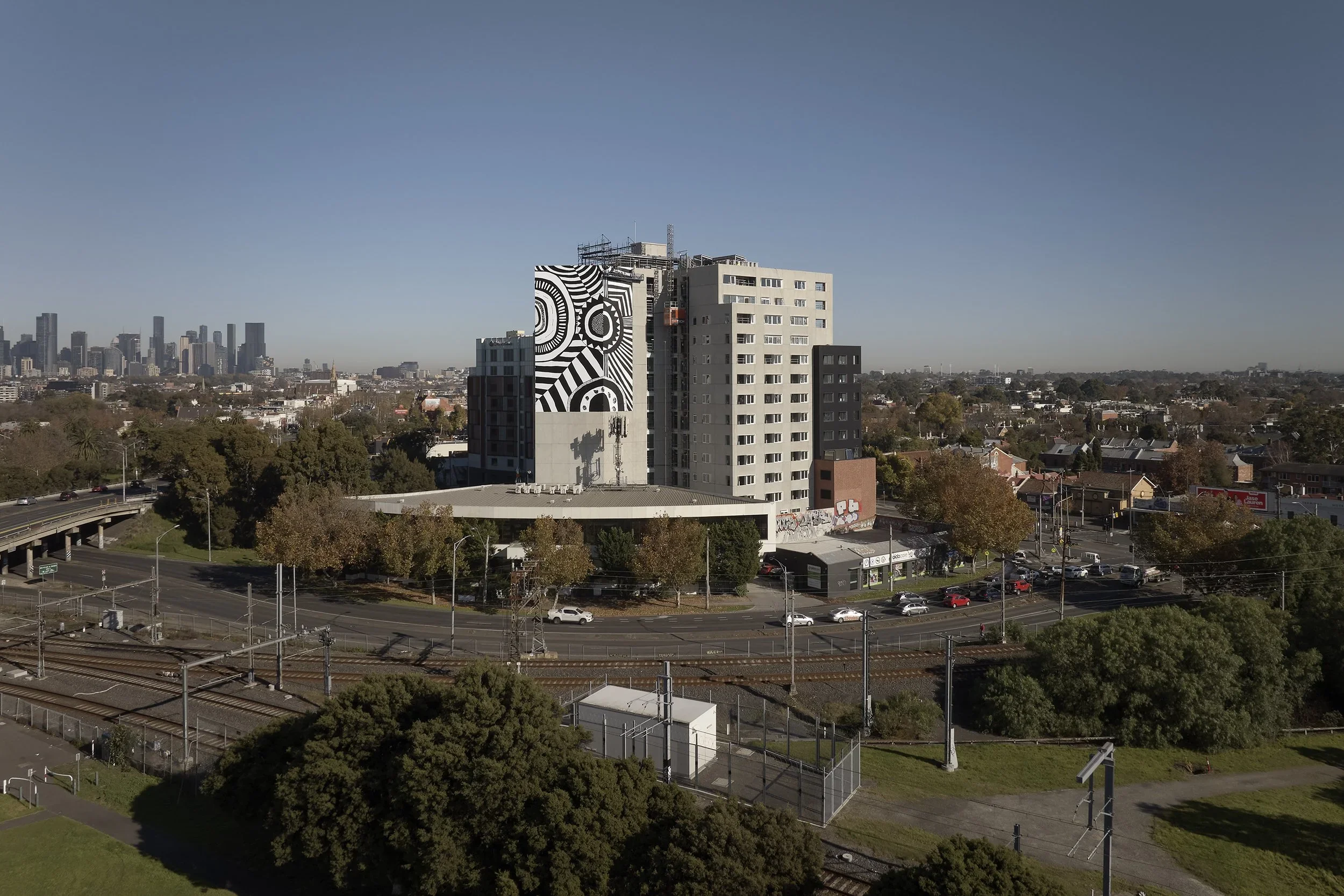Fitzroy North, a suburb know for its leafy green streets, mix of old brick buildings and modern development, ‘Convergence’ a mural by mixed cultural First Nations artist Lisa Waup forms a powerful visual anchor to the public realm of Fitzroy & Co.
